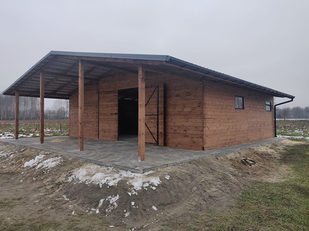 Drewniana stajnia korytarzowa o wymiarach 9m x 11m z trzema boksami w środku.