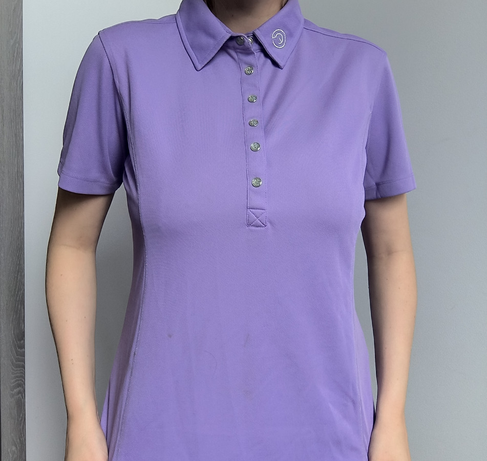 koszulka jezdziecka anky. Lawendowy liliowy piękny kolorek. Z srebrna nitka. Zapinana na kryte napki. Wykonana jest z technicznego materiału. Lekki oddychający przepuszczajacy. Polo jest w stanie bardzo dobrym ale na dole ma lekkie zabrudzenie. Rozmiar L szerokość 51cm x2 dl całkowita od ramienia 65 cm