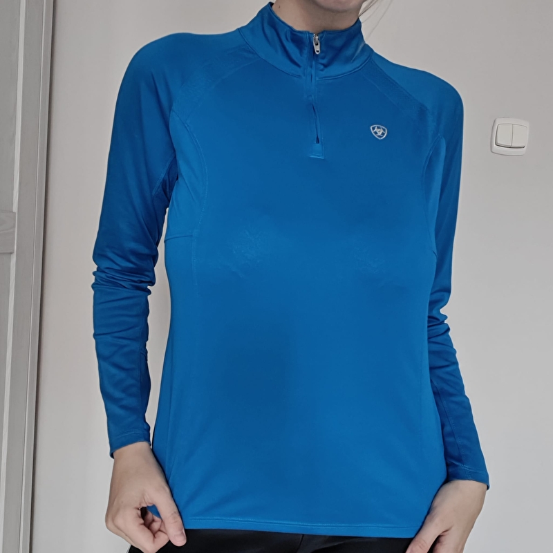 Koszulka jezdziecka Ariat. Piękny gleboki niebieski kolor. wykonana z technicznego oddychającego materiału cienka z elementami siateczki. . Stan bardzo dobry. Minimalne zaciągnięcia przy piersi z jednej strony widoczne na zdjęciu. Rozmiar 34 z metki 164 szerokość pachy 42 cm X2 dl całkowita od ramienia 57 cm Dl rękawa od pachy 50 cm
