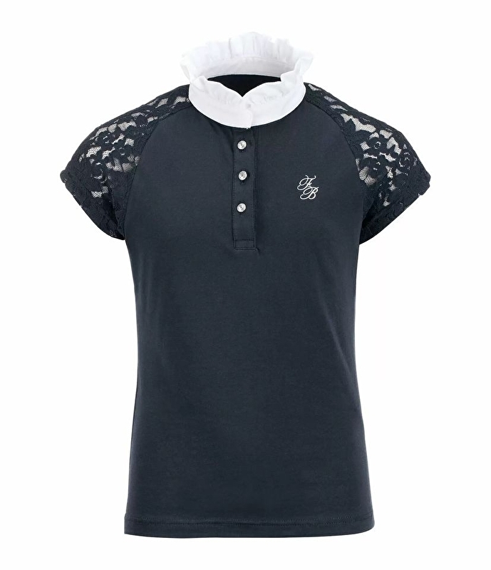 Modna dziecięca koszulka konkursowa wykonana z elastycznej bawełnianej dzianiny z raglanowymi rękawami z delikatnej, elastycznej koronki. Śliczne detale, takie jak marszczony kołnierz, srebrne logo Felix Bühler na przodzie i srebrne guziki. 95% bawełna, 5% spandex.