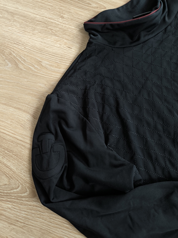Koszulka jezdziecka Cavalleria toscana. Czarna. Z bordowymi elementami. Od spodu ma bardzo leciutki meszek. Zapewnia optymalne ciepło podczas okresów przejściowych. Z przodu ciekawe Ala pikowanie z tyłu gładka. Logowanie na ramieniu. Bardzo wygodna. Elastyczna. Stan bardzo dobry. Rozmiar M