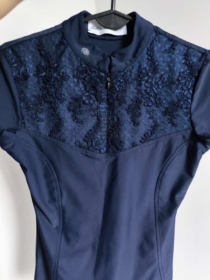 Koszulka jezdziecka design by dalia. Granatowa. Jeśli szukasz koszulki w której będziesz wyglądać szałowo i kobieco to napewno w tej koszuli od Dalii ;) Chwyta za oko dzięki tej cudnej koronce która wygląda poprostu pięknie.sprawia że koszula staje się inna niż wszystkie. Koronka od spodu ma Materiał jak reszta więc nic nie gryzie i nie drapie. Materiał lekko śliski który nie łapie brudu.elastyczny wygodny. Ładnie dopasowuje się do sylwetki, taliowana. Świetny stan. Godna polecenia. Rozmiar S