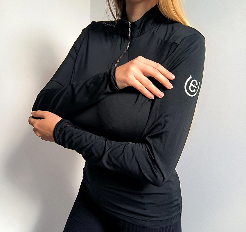 Koszulka jezdziecka Equestrian Stockholm czarna z srebrnymi wstawkami. Model Air Breeze marki Equestrian Stockholm to kolejna nowość na rynku. Wykonane są z szybkoschnącego i przyjaznego dla środowiska materiału, który dobrze oddycha i ma działanie chłodzące. Bluzy mają od wewnętrznej strony rękawa siateczkę, która umożliwia jeszcze lepszy przepływ powietrza.