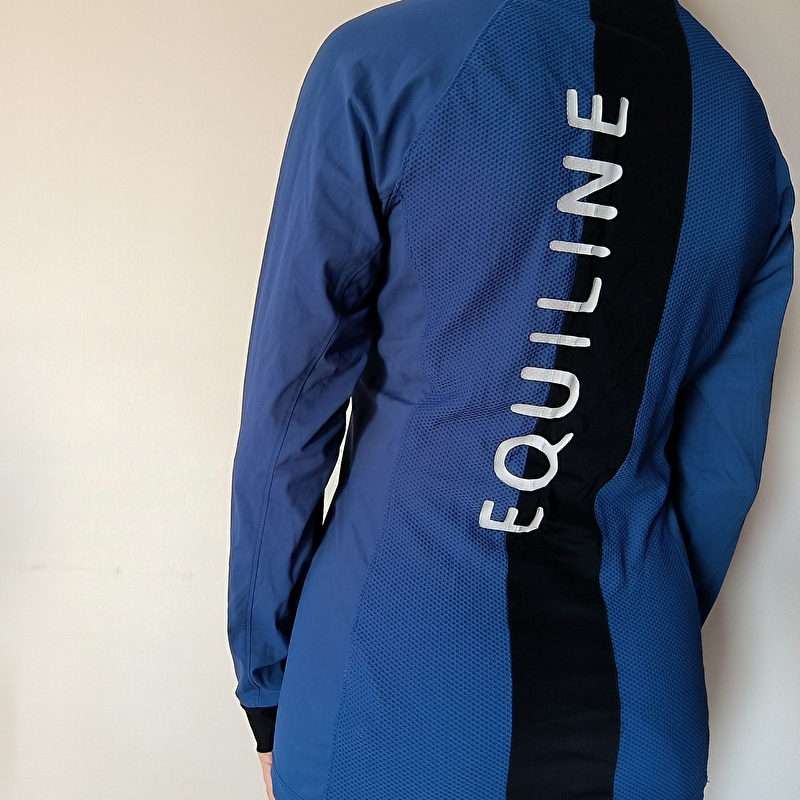 Koszulka jezdziecka Equiline. W przepięknym chabrowym kolorze. Z napisem na plecach. Bardzo techniczny materiał. Wykonana w części z wentylowanej siateczki. Pozostala część to śliskie rękawki i boki. Idealna na każdą porę roku. Elastyczna. Zdecydowanie chwyta za oko. Na szyji logowanie. Stan bardzo dobry, jedynie napis z tyłu na rantach liter mogą się ciut odklejac lub podważać. Rozmiar L