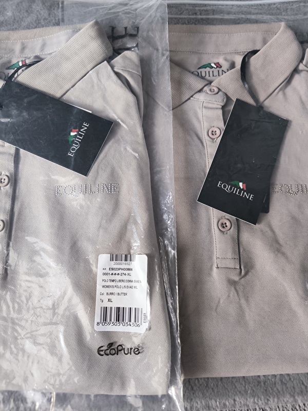 Koszulka jezdziecka Equiline Polo Damska Koszulka Polo Evae. Kolor butter jasny beżowy i sand sabbia ciemniejszy. Obie piaskowe beżowe.