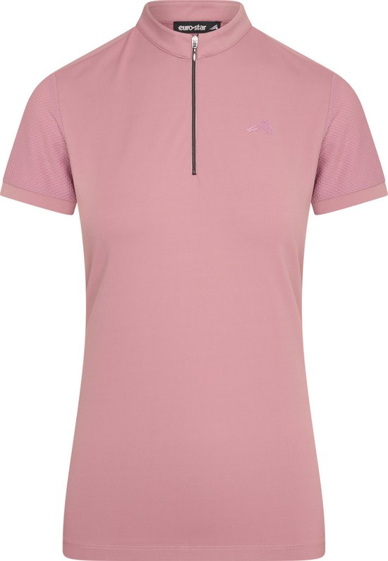 Koszulka jezdziecka euro star. Pudrowo różowy piękny kolor. Pięknie wykonana z technicznego elastycznego i wygodnego materiału. Na piersi ma małe logo głowy konika (logo euro star) które jest w kryształkach. Z tyłu przez plecy przebiega pas siateczki i rękawki równiez z siatki. Koszulka nowa z metką. Zdecydowanie to bestseller, który pokochały amazonki. Za funkcjonalność i wygląd.