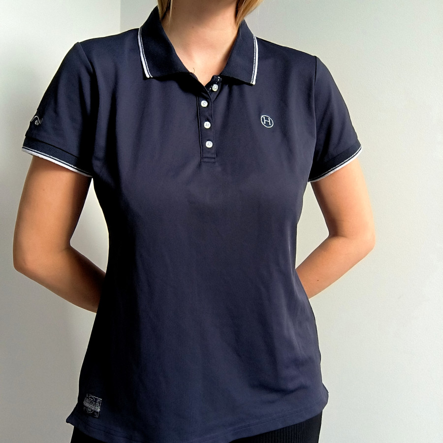 Koszulka jezdziecka Harcour. Granatowa z zdobieniami srebrnymi białymi. Przez to jest bardzo elegancka i nadaje się zarówno do stajni jak i na codzien z racji minimalistycznego logo. Material jest przyjemny lekki elastyczny. Stan bardzo dobry. Rozmiar L szerokość 50 cmx2