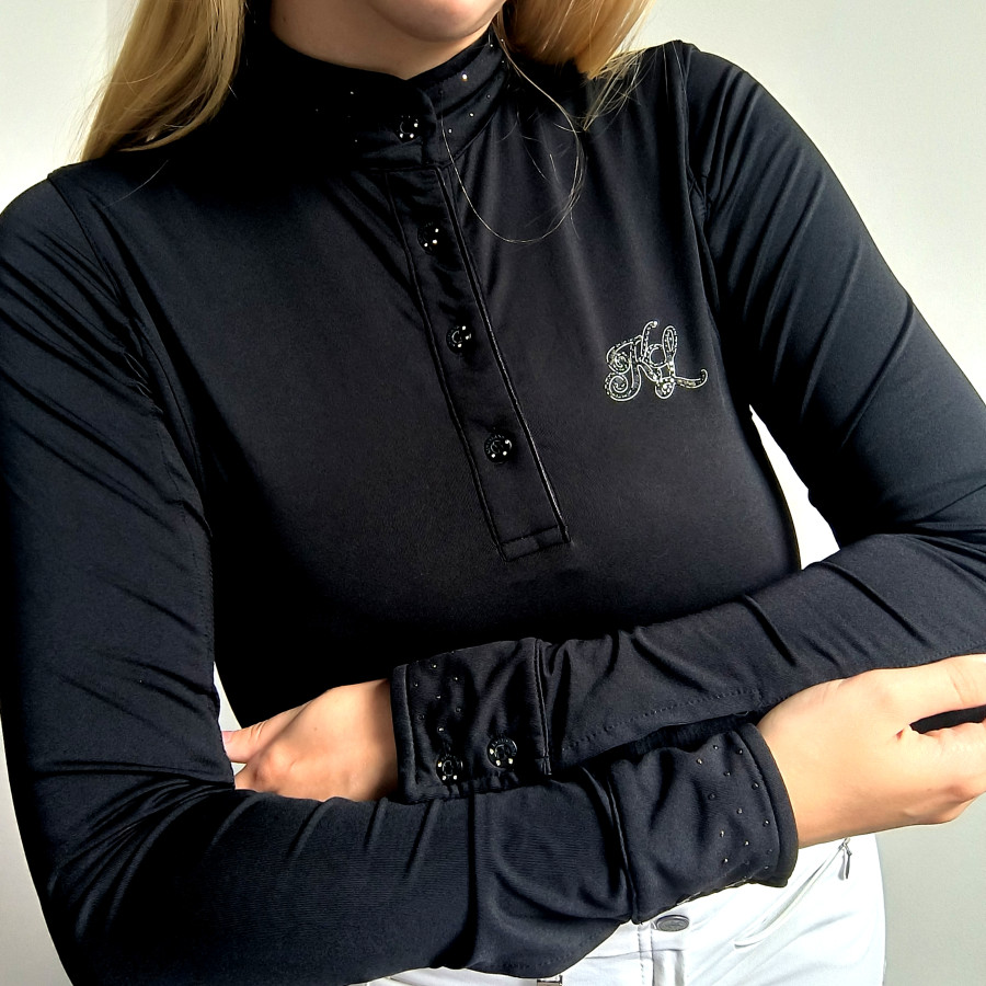 Koszulka jezdziecka Kingsland. Czarna Szukasz wyjątkowej koszuli? Takiej która robi wrażenie? Zerknij właśnie na przedstawiana Kingsland. Tą koszula przyciąga wzrok. Ma przepiękne kryształki które są na kołnierzu, logo i rękawach i guziczkach. Jest zjawiskowa !nowszy model. Dodatkowo ma siateczkę po wewnętrznej stronie rękawa co wspomaga wentylację ciała. Materiał jest elastyczny wygodny i łatwy w dopasowaniu do ciała. Stan bardzo dobry. Brakuje kilku kryształkow na logo na piersi Rozmiar XS szerokość 40 cm x2 dl całkowita od ramienia i rękawa 60 cm