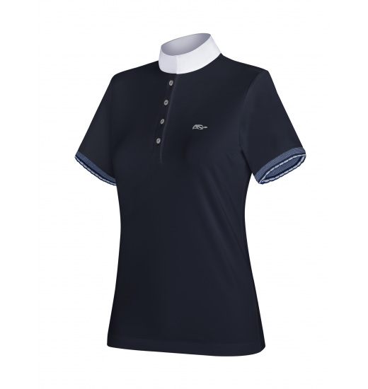 Koszulka konkursowa Anna Scarpati. Granatowa z krótkim rękawem i szarymi srebrnymi elementami. zachwyca prostą elegancją i funkcjonalnością. Koszulka jest wykonana z poliamidu i spandexu, dzięki czemu jest wyjątkowo szybkoschnąca, elastyczna i oddychająca. Oznacza to, że zawsze pozostaniesz suchy, nawet podczas intensywnego treningu lub zawodw Ponadto koszulka jest odporna na zapachy. Dzięki elastycznej tkaninie koszulka idealnie dopasowuje się do ciała i gwarantuje maksymalną swobodę ruchów. Zapięcie na guziki ułatwia i przyspiesza zakładanie i zdejmowanie koszulki. Małe, haftowane logo na klatce piersiowej i obramowanie rękawa sprawiają, że koszulka przyciąga wzrok Nowa z metką w pięknym opakowaniu w folii. Rozmiar 34 (it40)