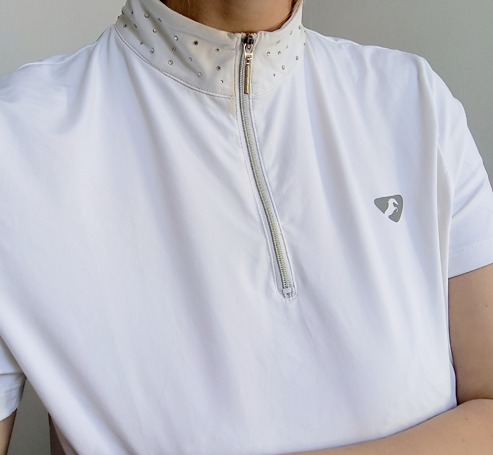 koszulka konkursowa aubrion. Biała idelana na zawody jeździeckie. Co dodaje jej wdzięku to kryształki wokół szyji. Sprawia to że koszula jest jeszcze ładniejsza. Dodatkowo jest funkcjonalna. Ma siateczke po boku co wspomaga wentylację ciała podczas intensywnych zawodów czy wyższych temperatur. Elastyczna wygodna komfortowa w noszeniu. Na zameczek. Super! Stan bardzo dobry. Ni zauważyłam zabrudzen i ubytków w kryształkach. Rozmiar M szerokość 47-52 cm x2 dl całkowita od ramienia 65 cm
