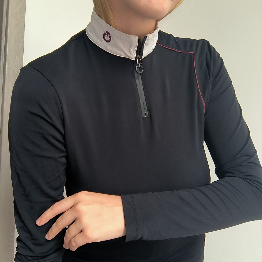 Koszulka jezdziecka konkursowa cavalleria toscana. Czarna z bordowym akcentem po boku. Podszyta lekko Polakiem idealna na okresy przejściowe oraz zimę. Wygodna. Elastyczna. Stan bardzo dobry lekkie ślady użytkowania. Rozmiar S szerokość 43-47 cm x2 pachy , dl całkowita od ramienia i rękaw 60 cm