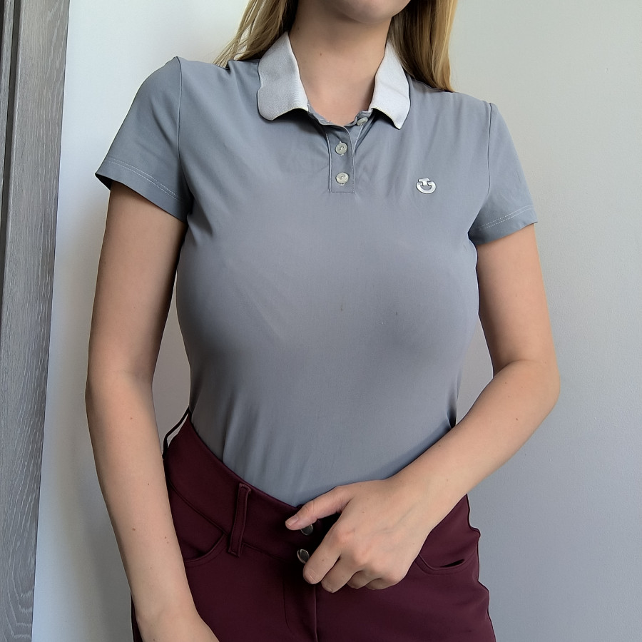 Koszulka konkursowa cavalleria toscana. Szara. Z ciekawym wzorem na plecach. Jest to taka Ala siateczka która wspomaga wentylację ciała podczas zawodów. Wygodny i lekki materiał. Stan bardzo dobry ale ma lekkie zabrudzenia do wyprania. Rozmiar S szef 44-49 cm x2 dl całkowita od ramienia 60 cm