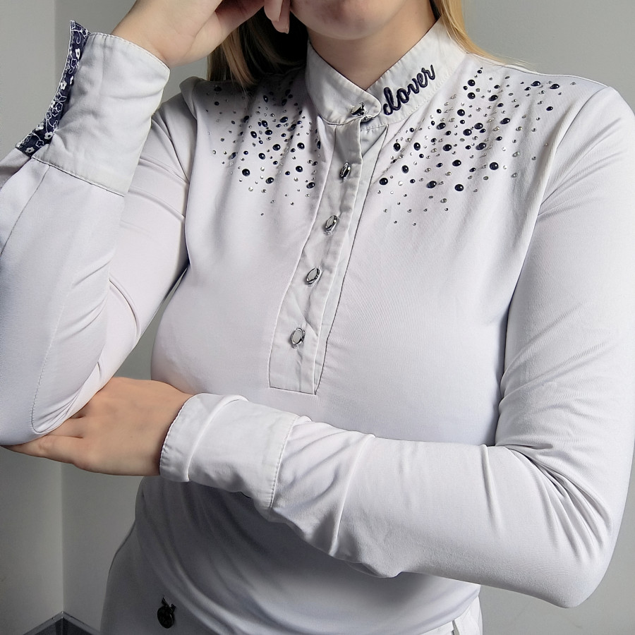 Koszulka konkursowa Clover.biala zjawiskowa z pięknie zdobionymi guzikami i zdobieniami. Jeśli chcesz wyróżnić się na parkurze to zdecydowanie w tej koszuli. Brakuje w całości około 10 krysztalkow których brak i tak jest niwelowany przez dużą ich ilość więc nadal wygląda to pięknie. Brak też jeden perełki na guziku. Mini przybrudzenie na brzegu mankietu Material jest bardzo elastyczny mega wygoda. Łatwo dopasuje się do sylwetki. Rozmiar XS pasuje też na S przez dużą elastyczność
