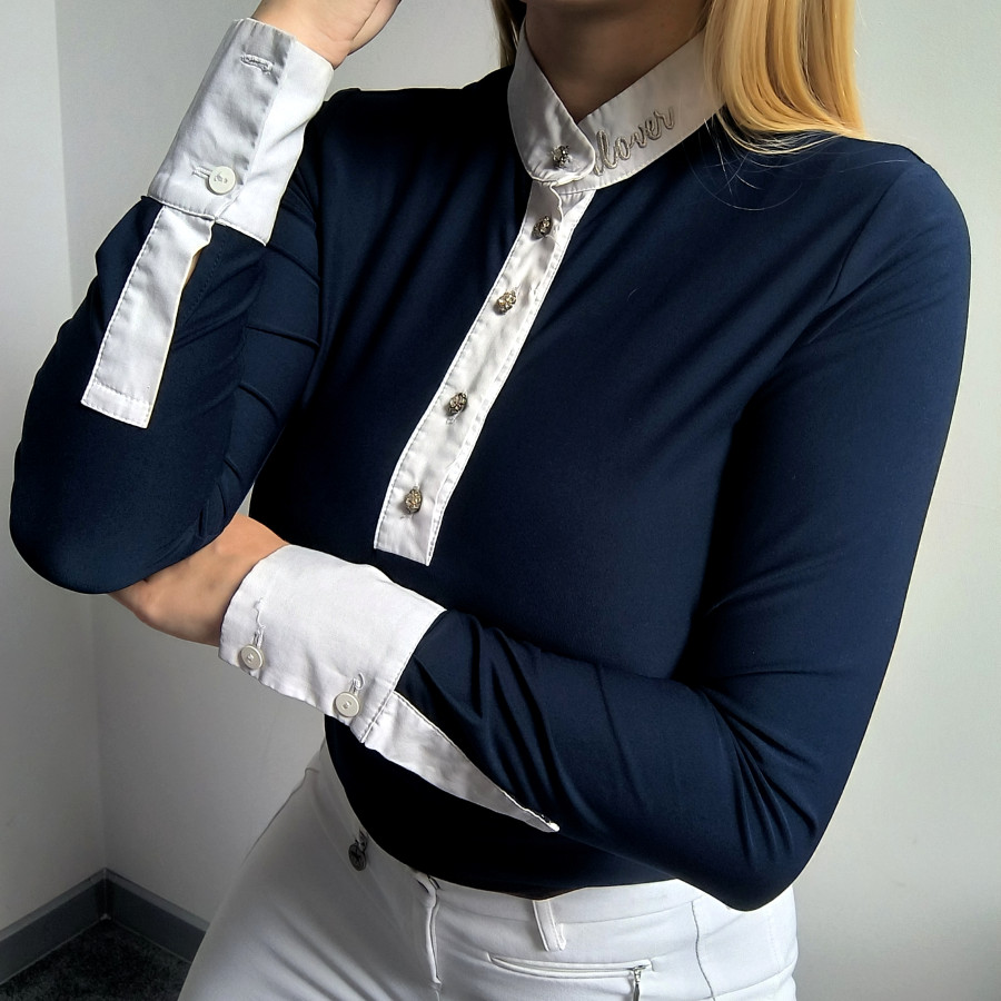 Koszulka konkursowa Clover. Granatowa z pięknie zdobionymi guzikami. Brakuje w nich czterech krysztalkow których brak i tak jest niwelowany przez dużą ich ilość które w guzikach się znajdują więc nadal wygląda to pięknie. Material jest bardzo elastyczny mega wygoda. Łatwo dopasuje się do sylwetki. Rozmiar XS