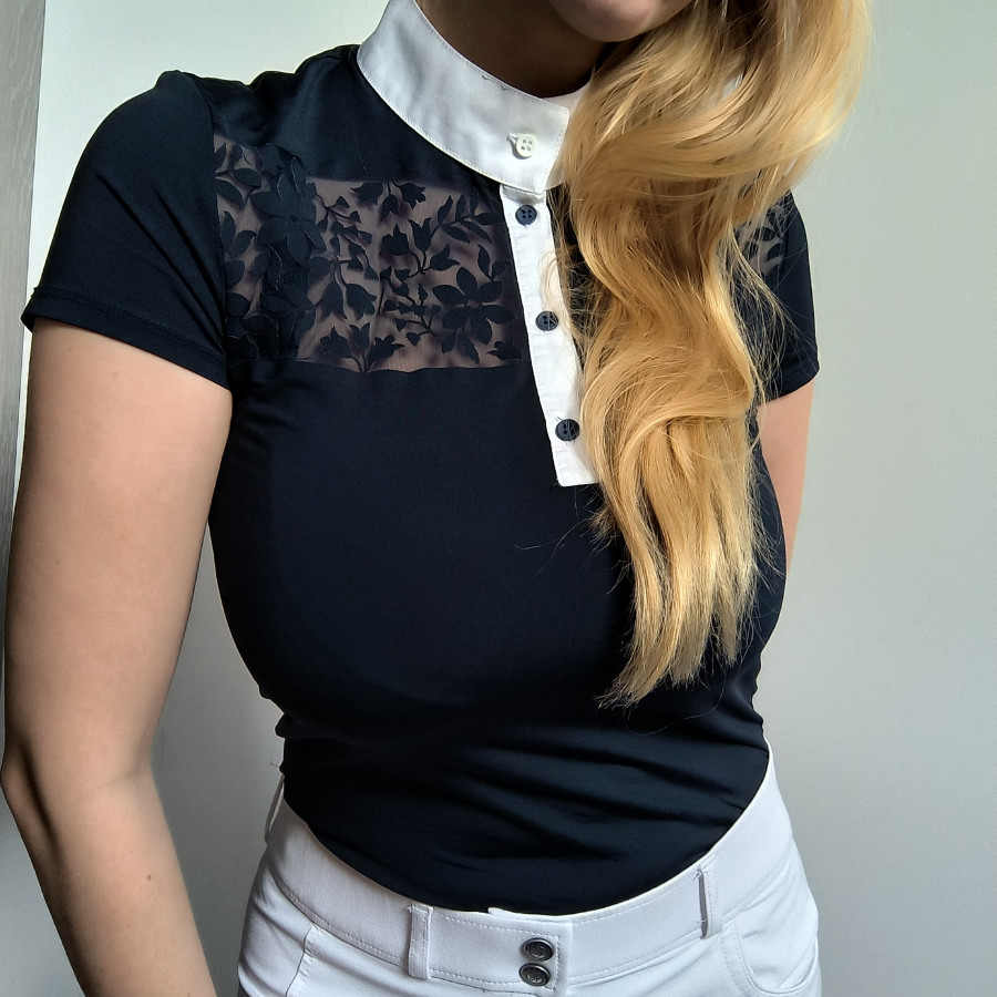 Koszulka konkursowa equiline. Granatowa z pięknym zdobieniem! Kwiatowy wzór prezentuje się elegancko i kobieco. Siateczka nie gryzie i jest komfortowa. Całość tworzy naprawdę piękna strukturę. Materiał jest lekko sliski nie brudzący. Koszulka jest elastyczna i wygodna. Stan bardzo dobry jedynie z tyłu lekko odchodzą kwiatki jak na zdjęciu. Rozmiar S 36 szerokość 42-47 cm x2dl całkowita 90 cm