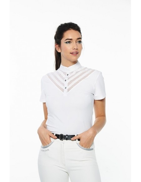 Koszulka jezdziecka harcour. Stan nowa z metką. Biała konkursowa Piękna, z siateczka na piersi. Pierwszy guzik na magnes. Materiał jest śliski nie łapie brudu. Wygodna. Rozmiar standardowy elastyczna. szerokość 49-53 cm x2 dl całkowita od ramienia 63 cm