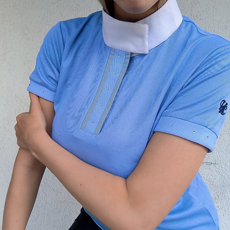 Koszulka konkursowa Horselife w pięknym kolorze baby blue. Dodatkowo ma piękne kryształki na rękawach i z przodu. Ślicznie się prezentuje. Do tego materiał jest lekki przewiewny, elastyczny. Kryte guziki. Stan bardzo dobry do przeprania. Rozmiar M szerokość 47 cm x2 dl całkowita od ramienia 60 cm