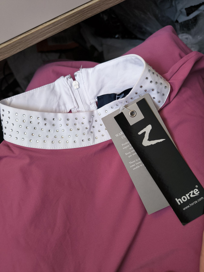 Koszulka konkursowa horze. Kolor to taki tzw. brudny róż. Ciemniejszy różowy. Wokół szyji ma przepiękne krysztalki które się mienia i dodają elegancji tej koszulce. Wygląda poprostu świetnie. Materiał jest lekki z Ala siateczki drobnej dzięki czemu jest przewiewna i oddychająca. Mocno elastyczna. Logowanie na rękawie. Nowa z metką. Rozmiar 42 xl szerokość 52-60 cm x2 dl całkowita od ramienia 68 cm idelane dla wysokich osób
