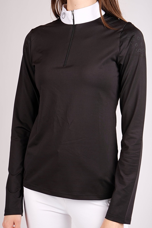 Koszulka konkursowa jeździecka Montar. Czarna. Nowa z metką. Z lekkimi dziureczkami na ramionach które pomagają w Wentylacji ciała podczas wyższych temperatur. Materiał lekki. Elastyczna. Rozm M szerokość 48-52 cm X2 dl całkowita od ramienia i rękaw 67 cm idelane dla wysokich osób