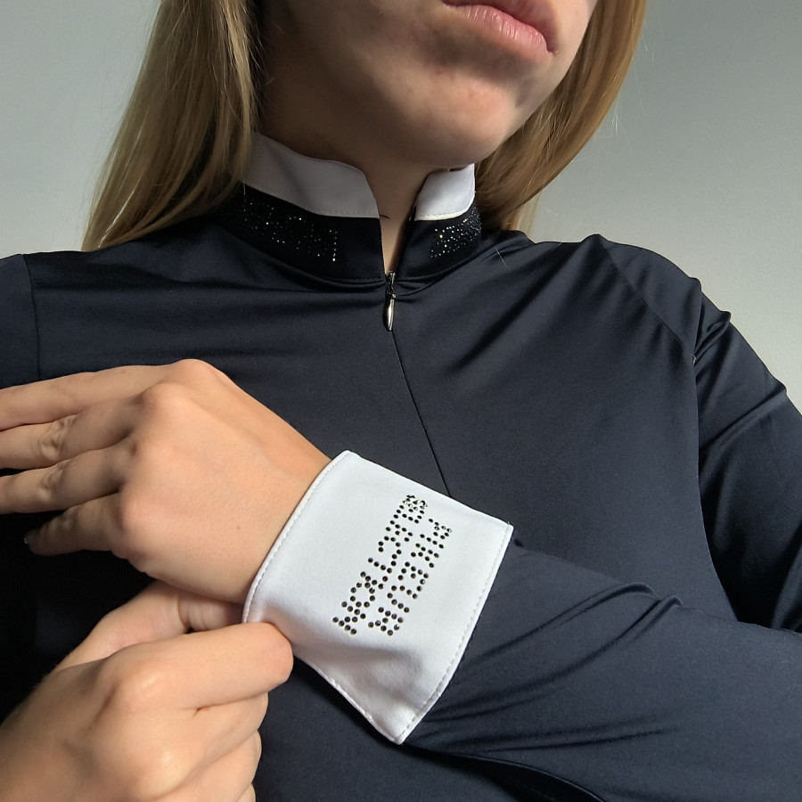 Sportowa, funkcyjna koszula jeździecka na zawody konkursowa Pikeur granatowa. Z pięknymi zdobieniami w postaci kryształkow wokół szyji i na mankiecie. Wygląda wyjątkowo i spektakularnie.