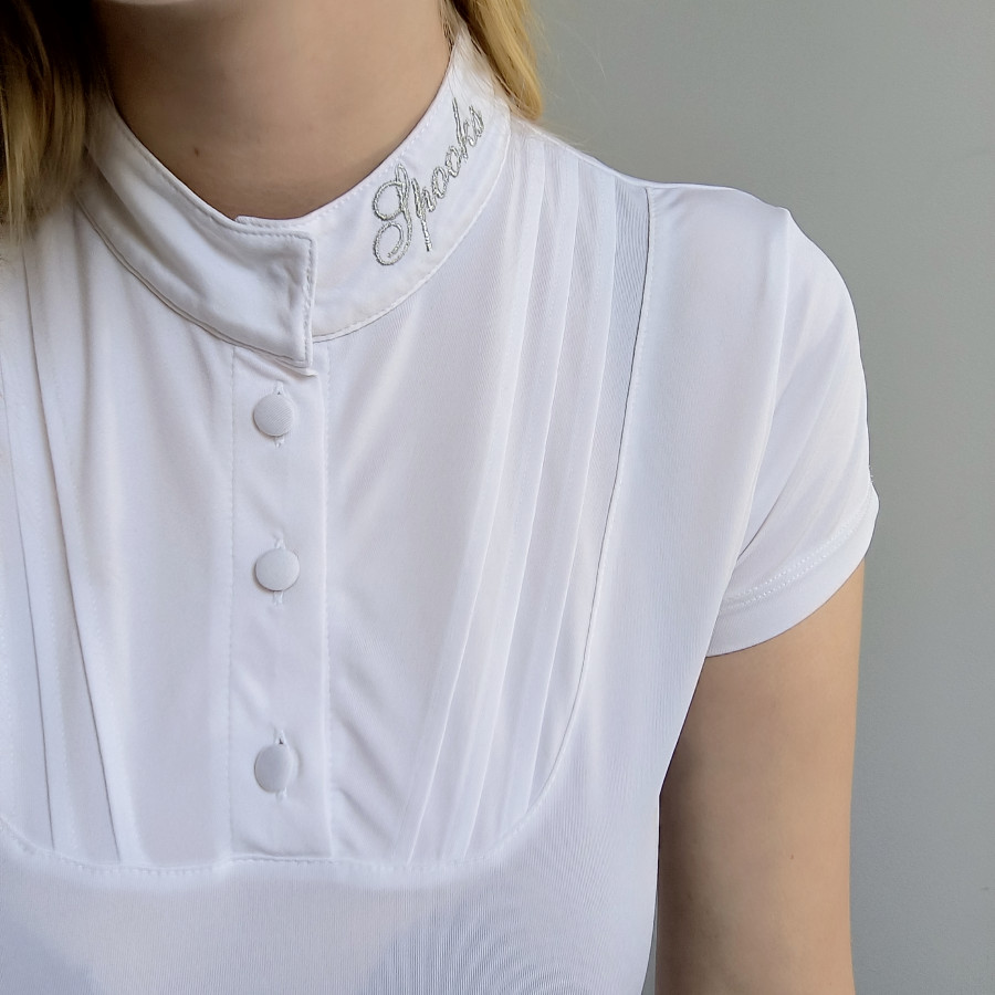 Koszulka konkursowa Spooks. Biała idelana na zawody. Materiał jest cienki lekki świetnie sprawdzi się w wysokich temperaturach. Z lekkim żabotem co nadaje jej "inności ". Materiał przyjemny w noszeniu łatwo dopasowuje się do ciała. Jest wygodny elastyczny dla każdego. Stan bardzo dobry. Nie zauważyłam żadnych zabrudzen. czysta.rozm S szerokość 44-48 cm x2 dl całkowita od ramienia 62 cm