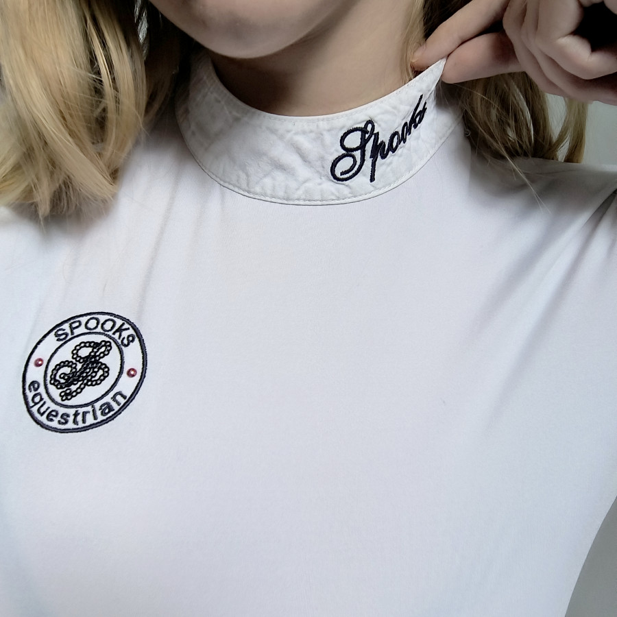 Koszulka konkursowa Spooks. Biała idelana na zawody. Rękawki są z siateczki. Materiał jest lekki delikatny. Bardzo elastyczny ładnie dopasowuje się do sylwetki. Na cekinowe logo na piersi. Jest elegancka i funkcjonalna. Jak na białą to jest czysta. Nie zauważyłam zabrudzen. Rozmiar XS szerokość 40-47cm x2 dl całkowita od ramienia i rękaw 62 cm