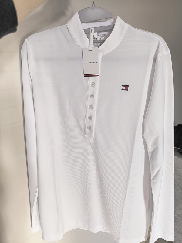 Wyjątkowo lekka, letnia biala koszula konkursowa Tommy Hilfiger Equestrian. z długim rękawem wykończonym dyskretnym wzorem w paski. Długie zapięcie na guziki skrywa tasiemkę z sygnowanych kolorach, a sama stójka jest śnieżnobiała. Ten model wyróżnia logo wyhaftowane na lewej piersi i tasiemka w sygnowanych kolorach z tyłu. Rozmiar XL