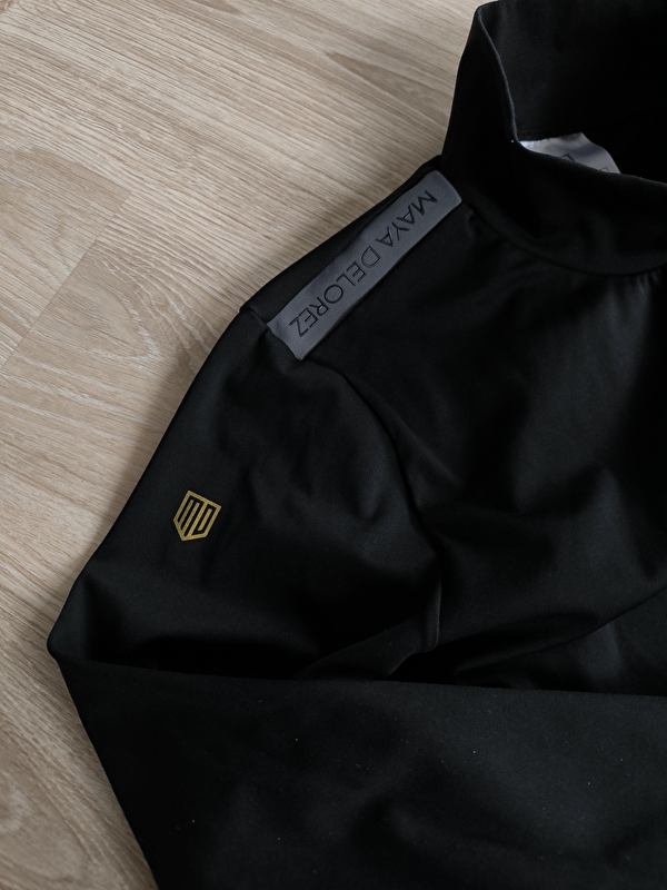 Koszulka jezdziecka Maya delorez. Czarna z złotym logo na ramieniu. I logowaniem na ramionach i z tyłu na plecach. Poza tym klasyczny krój. Elastyczna wygodna. Stan bardzo dobry Rozmiar M. Szerokość 48 cm x2 elastyczne, dl całkowita od ramienia i rękawa +- 63 cm