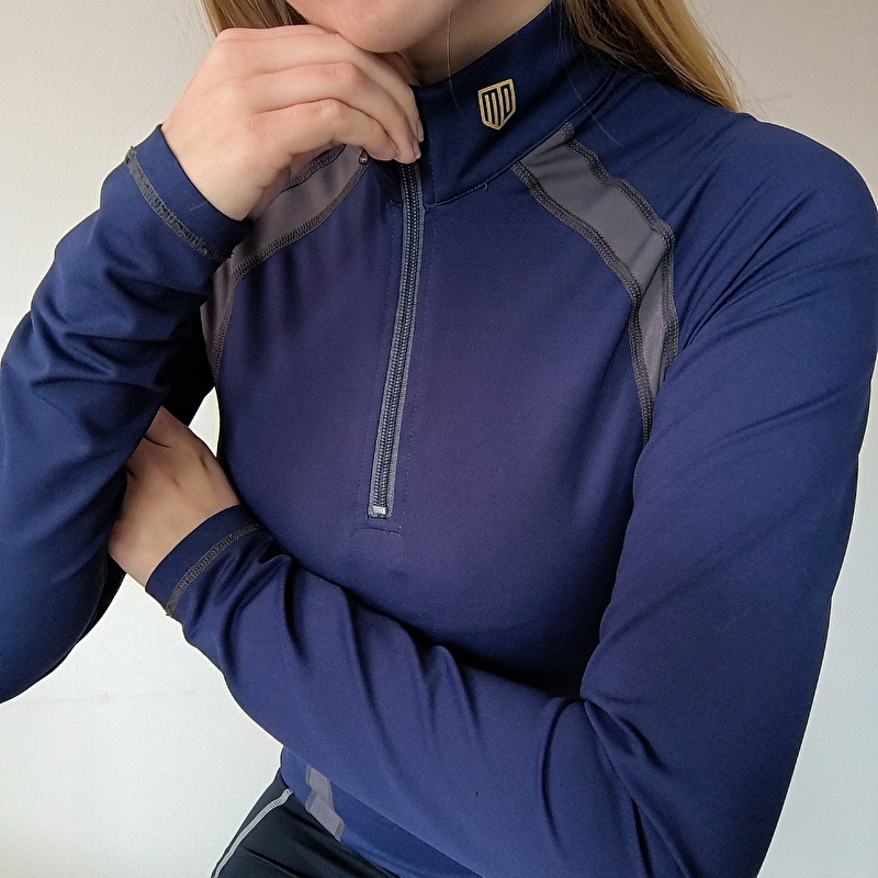 Koszulka jezdziecka Maya delorez. Granatowo szara. Złote logo przy szyji i logo na plecach. Pięknie wykonana super układa się na sylwetce. Jest ultra wygodna i elastyczna. Podkreśla sylwetkę, ma nowoczesny design. Napewno się z tym modelem polubisz ;) Stan bardzo dobry lekkie ślady użytkowania. Rozmiar XS, M