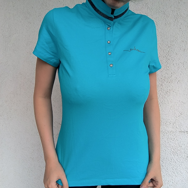 Koszulka jezdziecka Pikeur. Piękny żywy niebieski kolor. Ślicznie wykonana, zdobieniami kryształkami i świecąca tasiemka wokół kołnierza. Techiczny materiał.