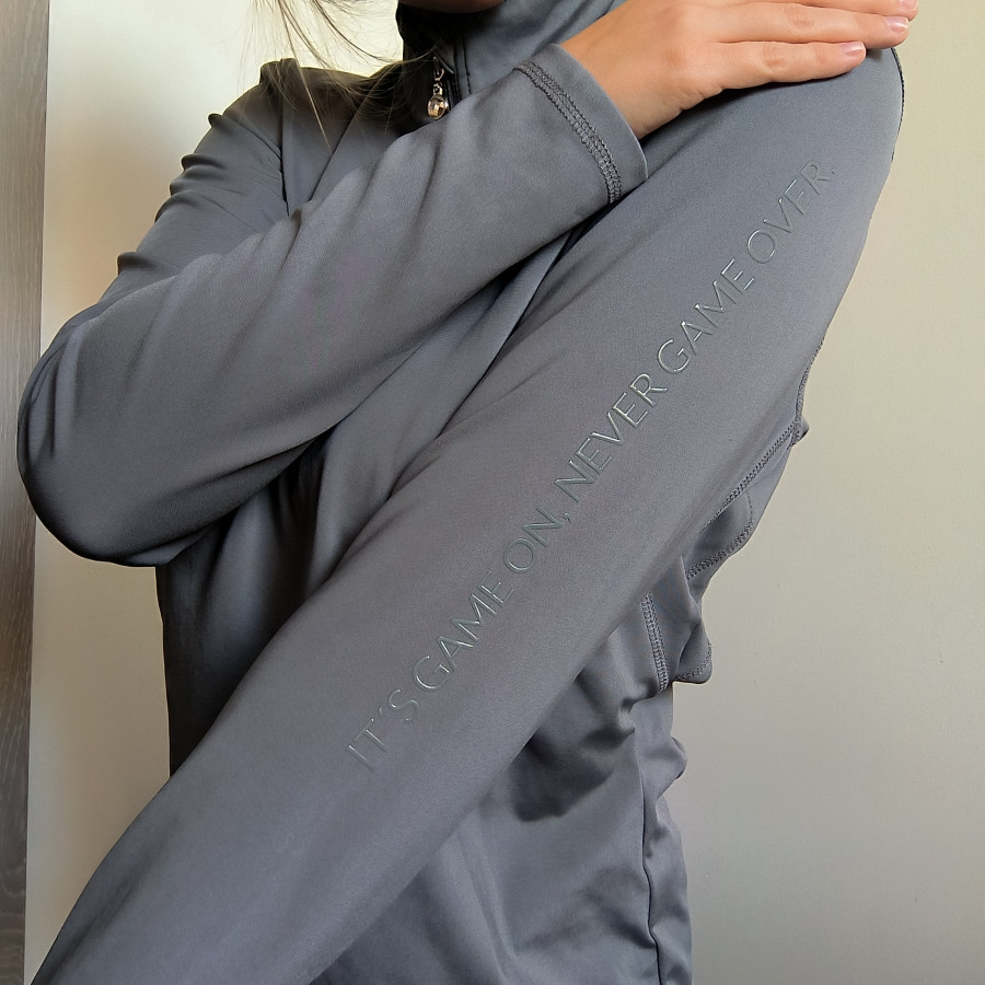 Koszulka jezdziecka Ps of sweden szara. Na jednym z rekawow ma napis motywacyjny bardzo fajny motyw. Na karku logowanie ps of sweden. Na zameczku kryształek duża dbałość o detale. Materiał lekki i bardzo elastyczny. Wygodna. stan bardzo dobry Rozm L