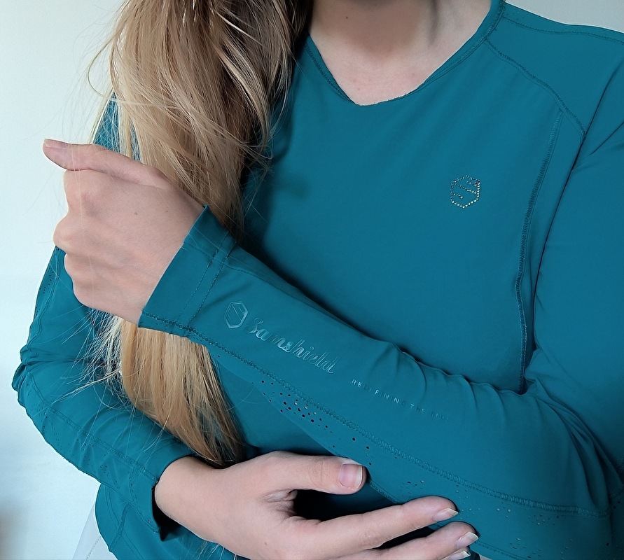 Koszulka jezdziecka samshield. Total premium line. Przepięknie wykonana. W cudnym turkusowym morskim kolorze przez wieku poszukiwanym. Koszulka jest zjawiskowa wyjątkowa w swoim rodzaju. Z zdobieniami na plecach i ręce. Logo jest z kryształkami swarovskiego. Materiał jest elastyczny przyjemny i oddychający. Zdecydowanie chwyta za oko. Stan idealny. Rozmiar XS. Cena katalogowa 500 pln
