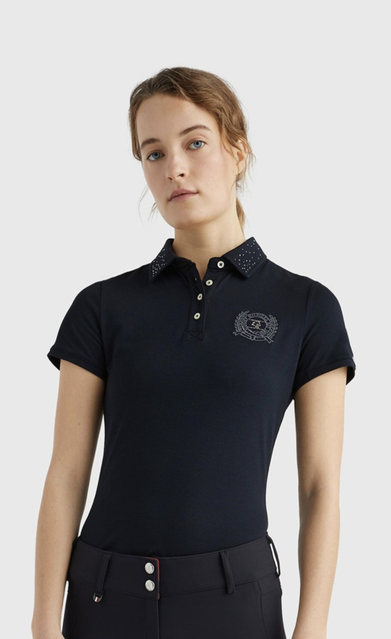 Koszulka jezdziecka Tommy Hilfiger Equestrian. Czarna polo. Przepięknie wykonana! Ma kryształki na kołnierzu oraz na piersi na logo. Subtelne ale chwytające za oko. Materiał też ekstra. Bardzo techiczny Wygodny elastyczny. Pięknie układa się na sylwetce. Zdecydowanie warte uwagi jeśli kochasz błyskotki i komfort. Rozmiar S . Nowe z metką.