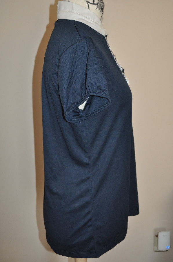 Elegancka, lekka damska koszulka konkursowa wykonana z oddychającego i szybkoschnącego materiału funkcjonalnego rozciągliwego w 4 kierunkach. Szykowne detale, takie jak guziki z kryształkami, plisa z guzikami z falbanami, rękawy ze ściągaczami.
