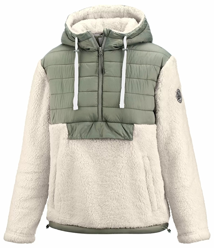 Wygodna kurtka z kapturem wykonana z miękkiego pluszowego futerka połączonego z watowanym nylonem. Wysoko zapinany, regulowany kaptur również podszyty pluszowym futerkiem, duża kieszeń na piersi zapinana na napy, 2 kieszenie na suwak z przodu, regulowany dół i naszywka STEEDS na rękawie.