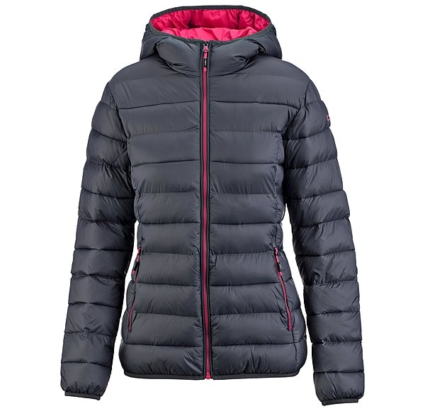 Sportowa, super lekka i pikowana kurtka z kapturem z podszewką wykonaną z wysokiej jakości imitacji puchu. 2 przednie kieszenie na suwak, dwukierunkowy zamek błyskawiczny z przodu, elastyczny pas i końce rękawów, kieszeń do spakowania. 100% poliamidu.