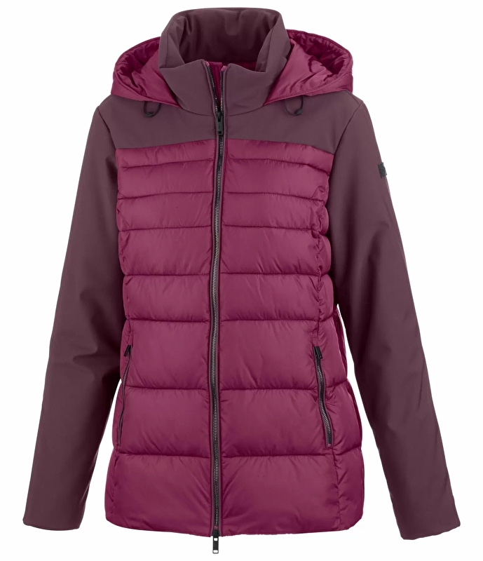 Sportowe, bardzo ładne połączenie pikowanego materiału z ciepłą podszewką i elastycznego materiału softshell. Wodoodporny i wiatroszczelny materiał. Regulowany kaptur, dwukierunkowy zamek błyskawiczny z przodu, 2 kieszenie na zamek, 1 kieszeń wewnętrzna na zamek. Przód i tył oraz kaptur 100% nylon, obszar softshell 92% poliester, 8% elastan.