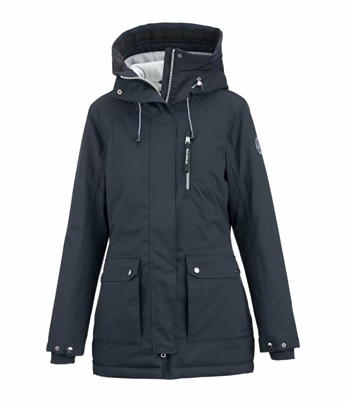 Funkcjonalny zimowy płaszcz do jazdy konnej z regulowanym kapturem, podszytym kontrastowym polarem i wiązany z tyłu. Wodoodporny (5000 mm), wiatroszczelny i oddychający. Wypełnienie z imitacji puchu, regulowane mankiety z elastycznymi mankietami, 2 kieszenie z klapką z przodu, 1 kieszeń na piersi zapinana na zamek, kryty dwukierunkowy zamek z przodu, 2 rozcięcia jeździeckie zapinane na zamek z tyłu. Na rękawie naszywka Felix Bühler, na kapturze subtelny silikonowy nadruk. 100% poliestru.