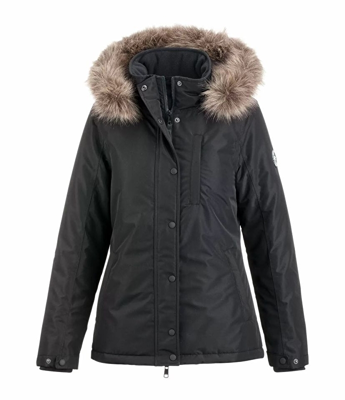 Topowa funkcjonalna damska kurtka jeździecka o dłuższym kroju o eleganckim wyglądzie. Wodoodporny (5000 mm), wiatroodporny i oddychający. Odpinany i regulowany kaptur z odpinanym kołnierzem ze sztucznego futra. Wypełnienie z imitacji puchu, regulowane mankiety z elastycznymi mankietami, 2 kieszenie na ręce zapinane na zamek, 1 kieszeń na piersi zapinana na zamek, kryty dwukierunkowy zamek błyskawiczny z przodu, 2 rozcięcia z zatrzaskami z tyłu, kaptur z możliwością doczepienia z tyłu. Naszywka Felix Bühler na rękawie, wewnętrzna strona kołnierza i kaptur podszyte polarem. 100% poliestru.