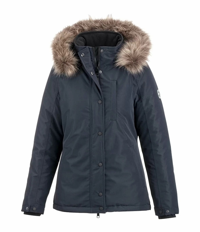 Topowa funkcjonalna damska kurtka jeździecka o dłuższym kroju o eleganckim wyglądzie. Wodoodporny (5000 mm), wiatroodporny i oddychający. Odpinany i regulowany kaptur z odpinanym kołnierzem ze sztucznego futra. Wypełnienie z imitacji puchu, regulowane mankiety z elastycznymi mankietami, 2 kieszenie na ręce zapinane na zamek, 1 kieszeń na piersi zapinana na zamek, kryty dwukierunkowy zamek błyskawiczny z przodu, 2 rozcięcia z zatrzaskami z tyłu, kaptur z możliwością doczepienia z tyłu. Naszywka Felix Bühler na rękawie, wewnętrzna strona kołnierza i kaptur podszyte polarem. 100% poliestru.