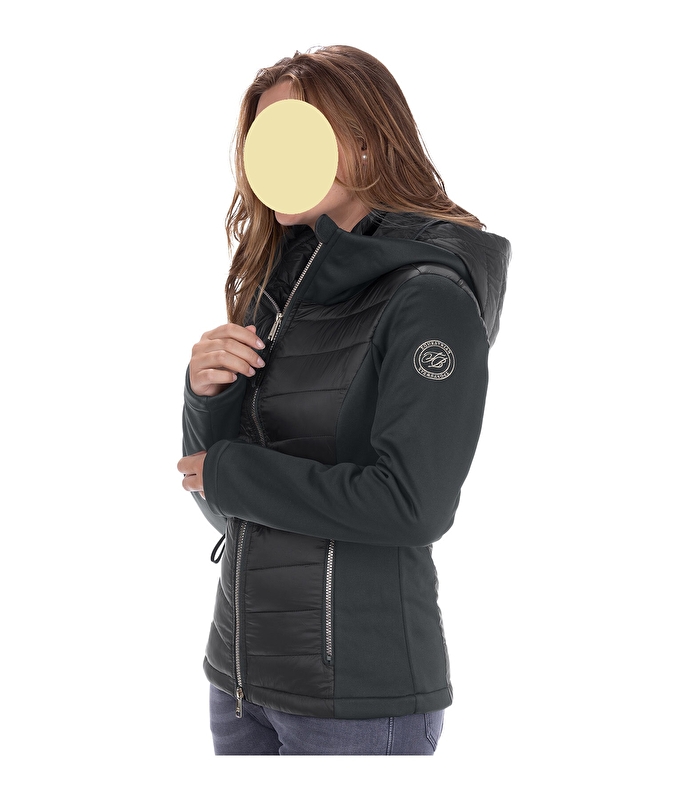 Niezwykle szykowna, wiatroszczelna kurtka jeździecka wykonana z miękkiego, połyskującego pikowanego materiału z lekkim wypełnieniem z imitacji puchu oraz rękawami i bocznymi wstawkami z elastycznego softshellu. Podwójny kołnierz, chowany, pikowany kaptur w dużym zewnętrznym kołnierzu zapinany na zamek i piękny haft. Błyszczący, dwukierunkowy zamek błyskawiczny z podszewką z ochroną podbródka oraz 2 kieszeniami z przodu zapinanymi na zamek i haftem Felixa Bühlera na rękawie. Regulowana szerokość dołu. Materiał 100% nylon, wstawki softshell 100% poliester.