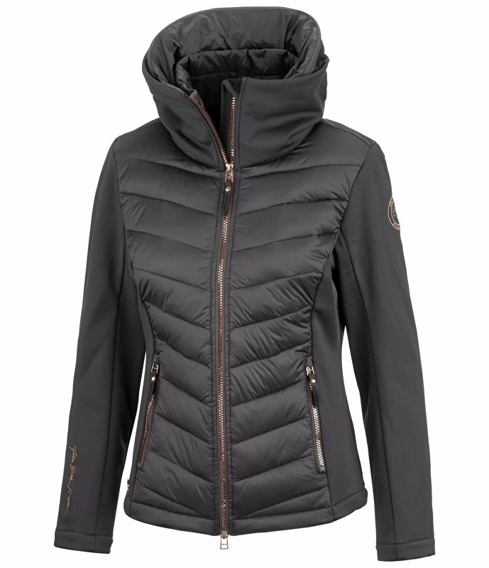 Niezwykle szykowna, wiatroszczelna kurtka jeździecka wykonana z miękkiego, połyskującego pikowanego materiału z lekkim wypełnieniem z imitacji puchu oraz rękawami i bocznymi wstawkami z elastycznego softshellu. Podwójny kołnierz, chowany, pikowany kaptur w dużym zewnętrznym kołnierzu zapinany na zamek i piękny haft. Błyszczący, dwukierunkowy zamek błyskawiczny z podszewką z ochroną podbródka oraz 2 kieszeniami z przodu zapinanymi na zamek i haftem Felixa Bühlera na rękawie. Regulowana szerokość dołu. Materiał 100% nylon, wstawki softshell 100% poliester.