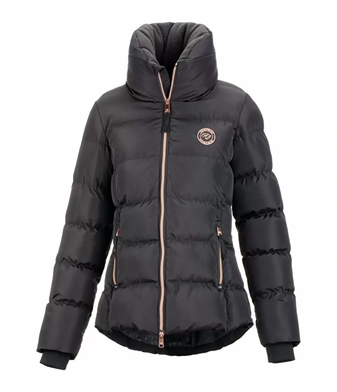 Sportowa, elegancka i wiatroszczelna damska pikowana kurtka jeździecka z wyjątkowo wysokim kołnierzem podszytym miękkim polarem i dłuższym wycięciem z tyłu. Ciepłe wypełnienie z imitacji puchu, mankiety z miękkiej dzianiny, podszyty dwukierunkowy zamek z przodu, 2 kieszenie na zamek z przodu i 1 kieszeń na zamek od wewnątrz. Wysokiej jakości haft Felixa Bühlera na piersi. 100% poliestru.