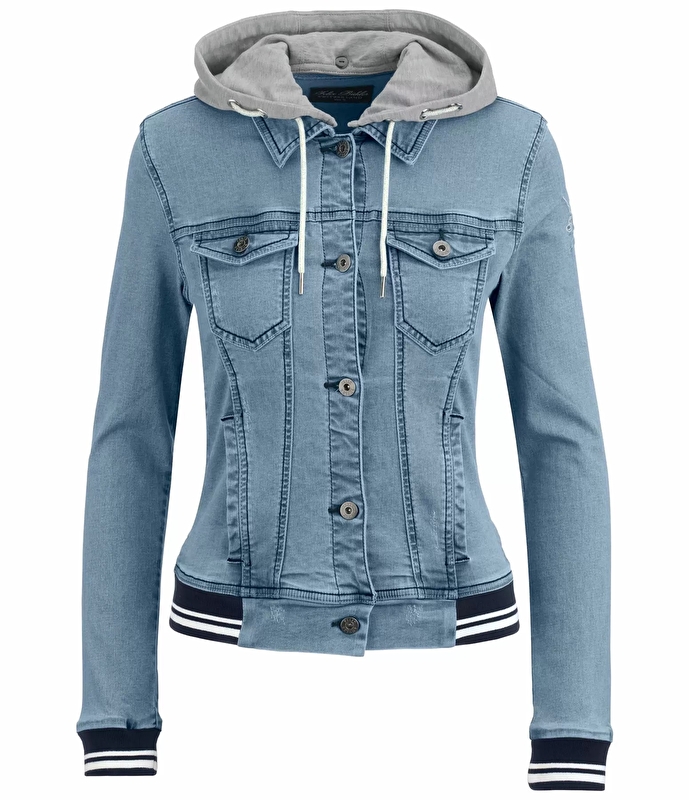 Świetna dżinsowa kurtka jeździecka w starym stylu z odpinanym kapturem, wykonana z dresowego materiału. Haftowane logo Felixa Bühlera na rękawie. 2 kieszenie wsuwane, 2 kieszenie na piersi z guzikami jeansowymi, rękawy i pas z prążkowanego materiału w paski. Materiał: 85% bawełna, 13% poliester, 2% elastan, wkładki dresowe 95% bawełna, 5% elastan.