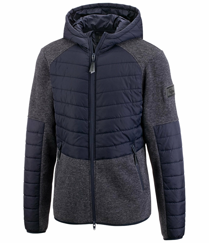 Funkcjonalne połączenie dzianiny polarowej i pikowanych wstawek. Pikowany kaptur, dwustronny zamek z przodu i 2 wsuwane kieszenie na zamek. 70% akryl, 15% nylon, 15% poliester.