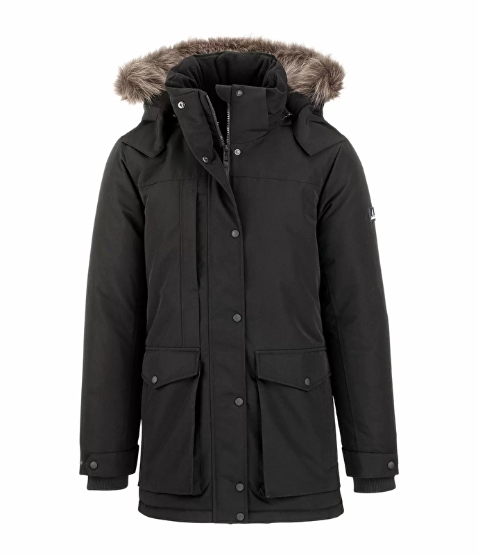 Nowoczesna, dłuższa męska kurtka jeździecka z wysokim kołnierzem i kapturem z odpinanym kołnierzem ze sztucznego futra. Kołnierzyk i kaptur podszyte są miękkim polarem, kaptur można odpiąć za pomocą zamka błyskawicznego lub przymocować z tyłu za pomocą zatrzasku. Oddychająca, wodoodporna i wiatroszczelna. Ciepło podszyty, kryty dwukierunkowy zamek błyskawiczny z osłoną podbródka, 2 duże kieszenie z klapką zapinane na zatrzaski z przodu i 1 kieszeń na piersi zapinana na zamek. Na rękawie i wewnętrznej podszewce naszywka Felixa Bühlera z nadrukiem logo na całej powierzchni. Boczne rozcięcia jeździeckie zapinane na zamek, elastyczne mankiety z drobno prążkowanego materiału, regulowana szerokość rękawów.