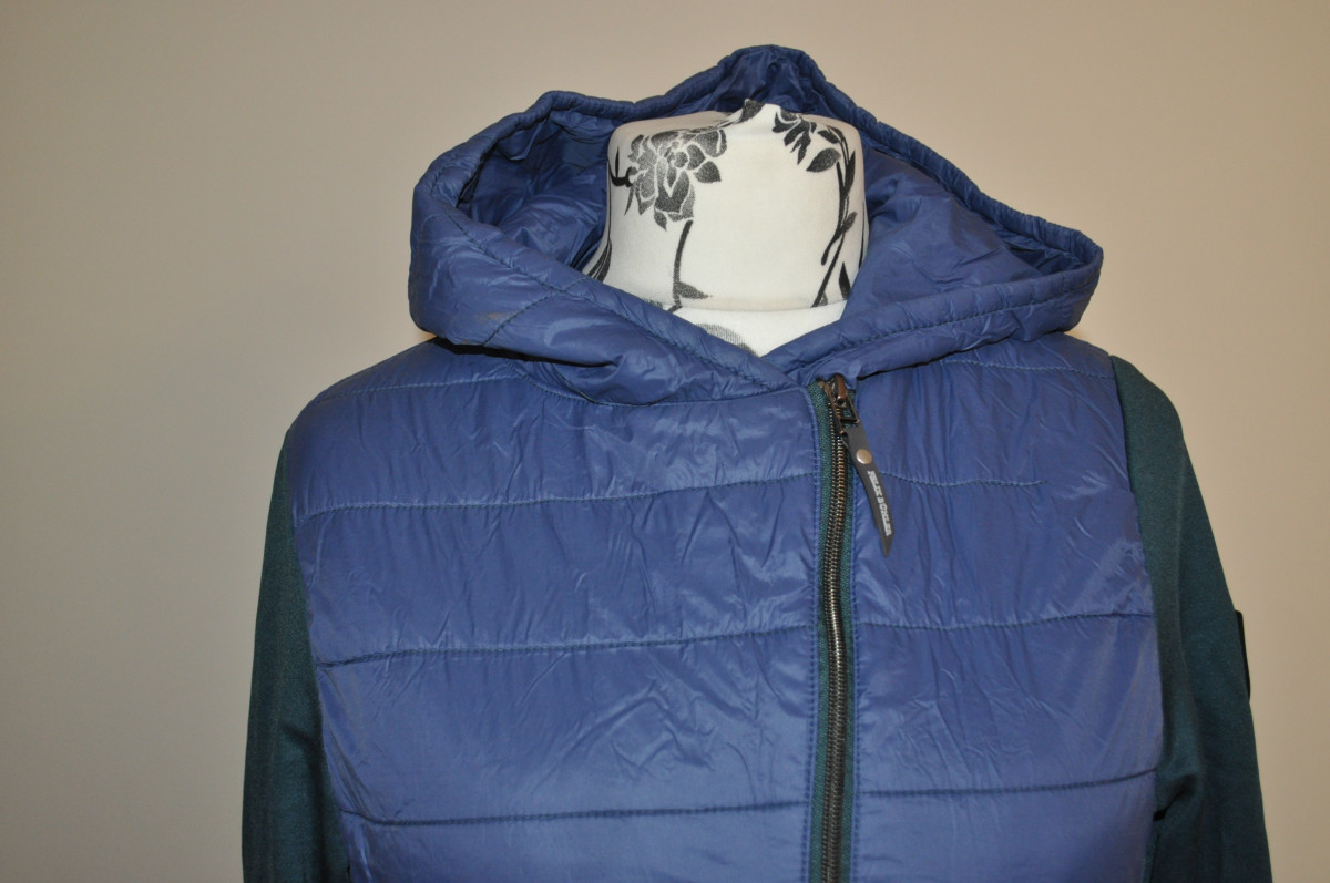 Kurtka posiada rozprucia na szwach w środku kaptura oraz przybrudzenia na przodzie - zdjęcia.
