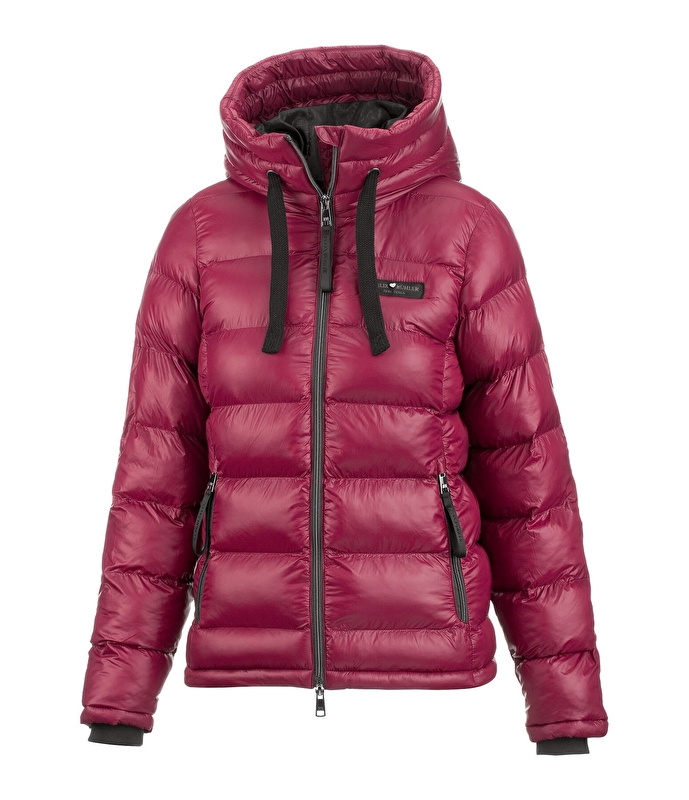 Pikowana kurtka jeździecka z wysokim, regulowanym kapturem przypinanym z tyłu i ciepłym wypełnieniem z wysokiej jakości imitacji puchu. Wewnątrz podszewka z subtelnym wytłoczonym wzorem. Podszyty dwukierunkowy zamek błyskawiczny z ochroną podbródka, 2 przednie kieszenie zapinane na zamek, regulowana szerokość dołu i mankiety wykonane z miękkiego prążkowanego materiału. Na piersi taśma Felixa Bühlera z metalowym sercem. 100% nylonu.