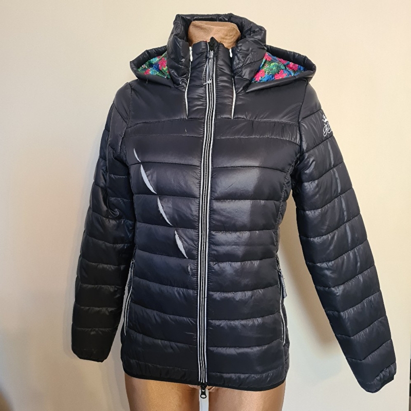 Bardzo lekka i pikowana kurtka jeździecka z kapturem z wypełnieniem z wysokiej jakości imitacji puchu. Kontrastowa podszewka wewnętrzna z subtelnym wytłoczonym wzorem kwiatowym . Podszyty dwukierunkowy zamek z przodu, 2 przednie kieszenie na zamek.