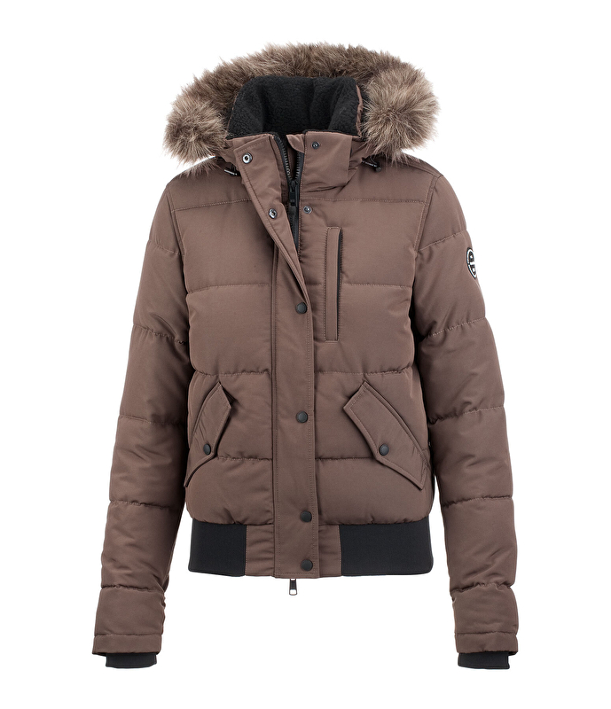 Sportowa, pikowana kurtka jeździecka z odpinanym i regulowanym kapturem z odpinanym kołnierzem ze sztucznego futra. Odporny na wodę i wiatr. Ciepłe wypełnienie z imitacji puchu, kołnierz i kaptur podszyte miękkim polarem Sherpa. Kryty 2-kierunkowy zamek z przodu z osłoną podbródka, 2 wsuwane kieszenie z zatrzaskami i kieszeń na piersi na suwak. Rękawy i dół wykończone miękkimi ściągaczami. Podszewka z subtelnym tłoczonym wzorem, wszystkie kieszenie wyściełane polarem. 100% poliestru.